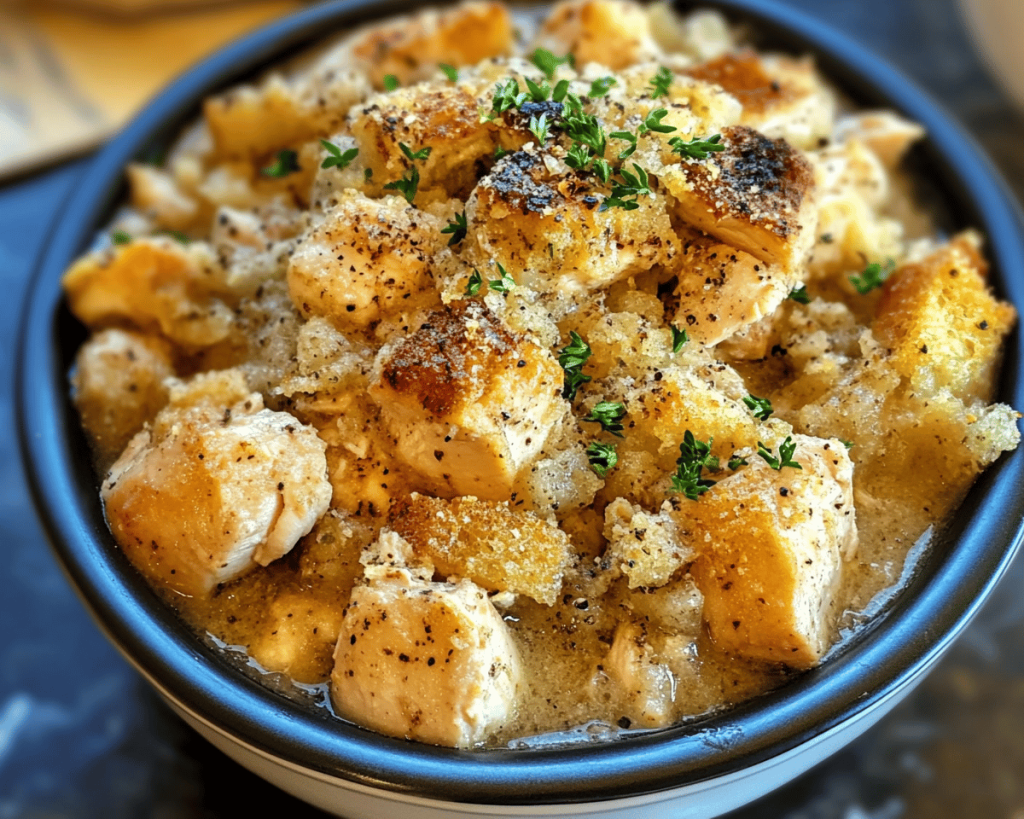 This recipe is more than just a two-step process tossed into a slow cooker; it’s a tribute to those cherished Southern nights spent around the dinner table, sharing stories and laughter. The unique blend of tender chicken and fluffy, herb-infused dressing envelops each bite in sheer comfort. Whether you’re serving it on a special occasion or craving a traditional family dinner, this dish promises to warm your belly and soothe your soul.