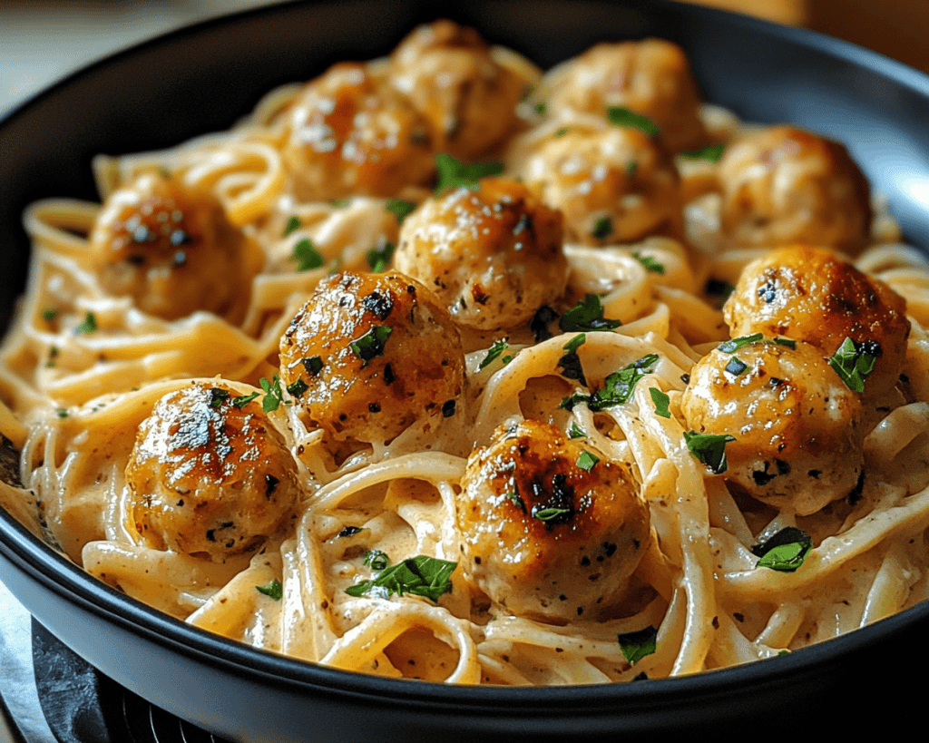 These chicken balls are not only a crowd-pleaser but also incredibly versatile. Served as a main course, they bring comfort and joy, while the creamy pasta enriches the experience, transforming an ordinary meal into something memorable. Think of the soft texture of the chicken paired with the smooth, delightful pasta — it’s pure delight!