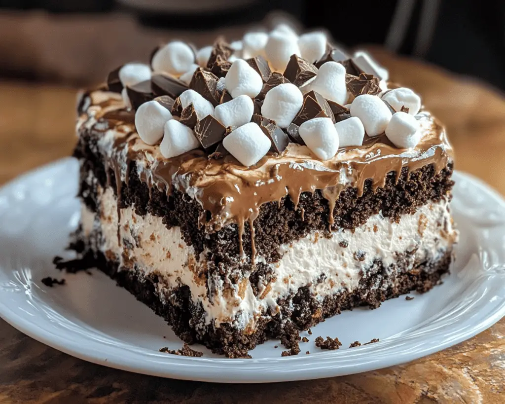 Furthermore, the flavor combination of rich chocolate and fluffy marshmallow hits every taste bud in a delightful way. It’s **family-friendly**, meaning it’s a hit with both kids and adults alike. Whether you’re celebrating a birthday, hosting a potluck, or just craving a sweet treat after dinner, this cake fits the bill perfectly.