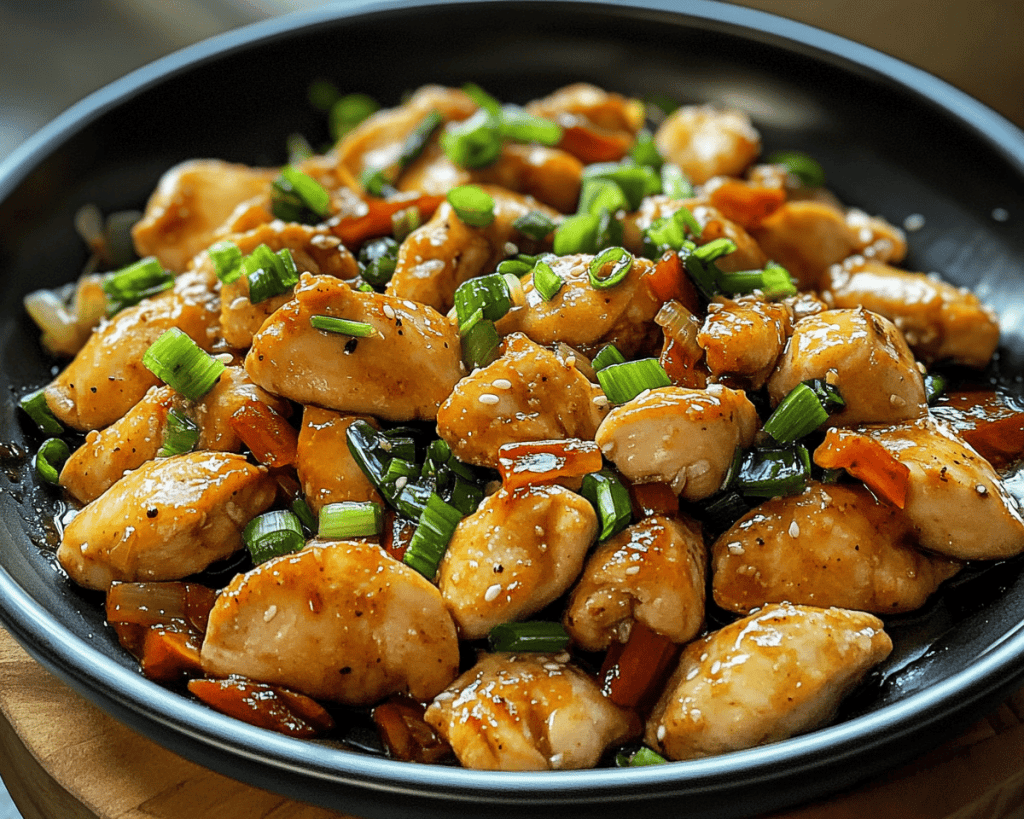 5. **Add the Scallions and Sauce:** Stir in the sliced scallions, followed by the soy sauce. If you wish for extra thickness, dissolve the cornstarch in 2 tablespoons of water and add that to the pan. Stir everything together for about 2-3 minutes, letting the sauce thicken and coat the chicken.