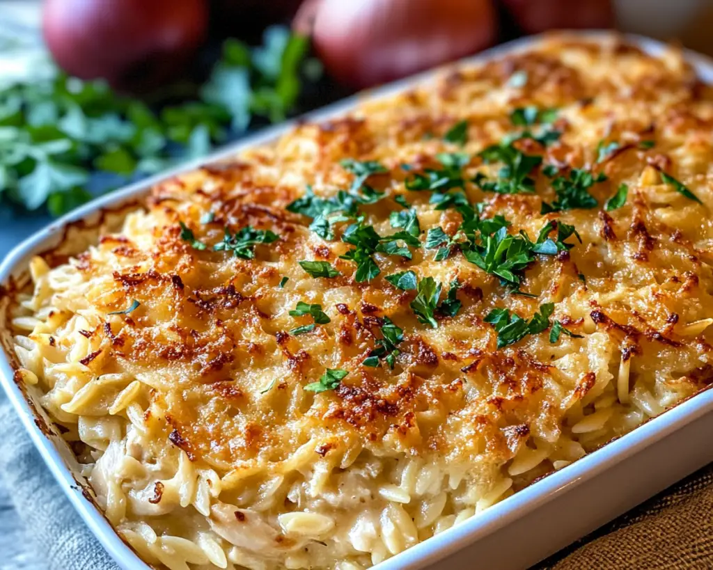 French Onion Chicken Orzo Casserole